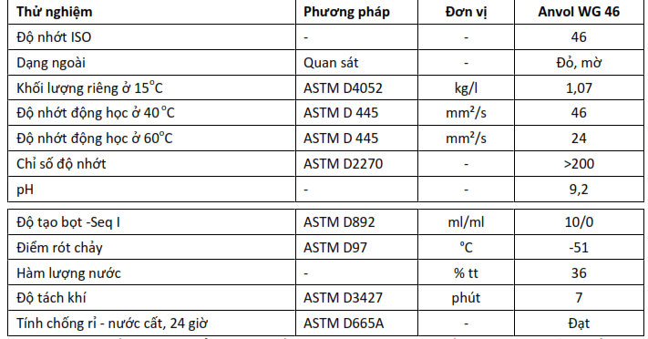 Anvol WG 46 là dầu thủy lực chống cháy gốc nước-glycol loại HF-C, có các phụ gia chống mài mòn và chống ăn mòn, có tính năng chống rỉ và chống mài mòn tốt trong các thử nghiệm bơm thủy lực. Các tính chất chống bọt, dễ chảy ở nhiệt độ thấp, bền nhũ tương và ổn định đều rất tốt trong các thử nghiệm về tính ổn định trong khi tồn trữ.