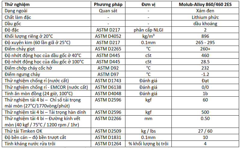Mỡ bôi trơn Castrol Molub-Alloy™ 860 ES là loại mỡ gốc lithium phức đa dụng tính năng cao được pha chế từ dầu gốc chất lượng cao, chất bôi trơn rắn và các loại phụ gia chống ăn mòn được chọn lọc kỹ càng nhằm chống lại các loại nước công nghiệp có tính ăn mòn cao. Loại mỡ này được thiết kế để kéo dài tuổi thọ của các ổ bi làm việc trong điều kiện nặng nhọc và nhiệt độ tăng cao. Mỡ bôi trơn Molub-Alloy 860/460-2ES cung cấp màn bôi trơn phù hợp cho các ứng dụng làm việc liên tục trong thời gian dài ở tốc độ chậm đến trung bình, tải trọng nặng, và/hoặc nhiệt độ cao. Khả năng chịu tải và chống mài mòn của MolubAlloy 860/460-2ES vượt trội hơn hẳn các loại mỡ phức thông dụng. Tính năng cao là kết quả của sự phân tán các chất phụ gia hóa học cùng với chất bôi trơn rắn Molub-Alloy được chọn lọc trong cấu trúc mỡ. Lợi ích của các loại chất bôi trơn rắn này thể hiện tốt nhất ở tốc độ thấp hoặc khi ổ bi làm việc liên tục trong điều kiện tải trọng nặng và va đập. Các chất bôi trơn rắn này cũng bảo vệ các bề mặt ổ bi vừa mới vận hành trong quá trình chạy thử nghiệm. Bề mặt ổ bi tốt ngay từ đầu là điều kiện tiên quyết để kéo dài tuổi thọ của ổ bi.