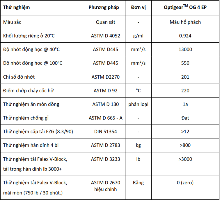 Castrol Optigear OG 4 EP được phát triển đặc biệt để sử dụng cho các loại bánh răng hở, băng máy và ổ đỡ chịu tải trọng nặng bằng phương pháp nhúng hoặc phun dầu. Optigear OG 4 EP được pha chế từ dầu gốc có độ nhớt cao kết hợp với công nghệ phụ gia cực áp (EP) nhằm cung cấp khả năng bảo vệ tối ưu cho bánh răng/ ổ đỡ. Sản phẩm này được thiết kế đặc biệt phù hợp với bánh răng hở Type 2 trong hệ thống lò quay và máy nghiền xi măng, máy nghiền than trong nhà máy sản xuất điện, các máy nghiền trong ngành khai thác mỏ và quặng, máy nghiền SAG và máy nghiền Pebble. Optigear OG 4 EP cũng phù hợp để sử dụng cho các ổ lăn giảm ma sát và ổ trượt chịu tải trọng nặng.