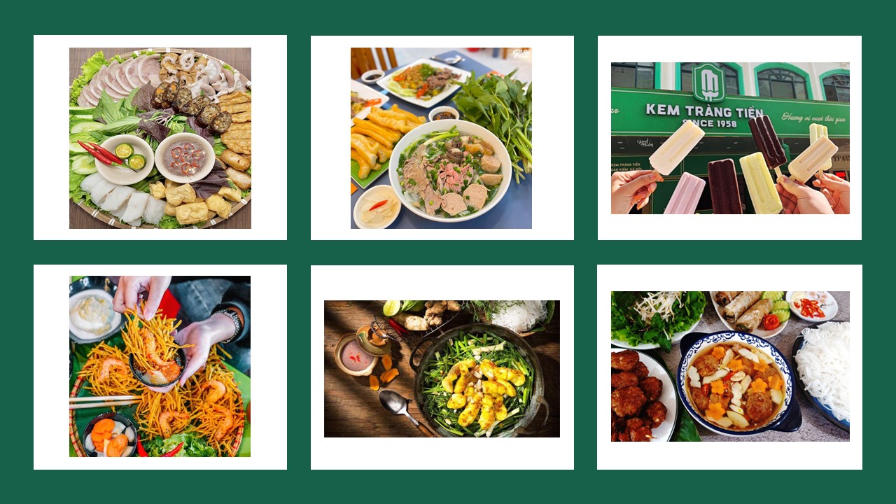 Nhắc đến thủ đô của Nước Cộng Hòa Xã Hội Chủ Nghĩa Việt Nam thì có vô số món ăn đặc sản khi đặt chân đến: Phở Hà Nội, Bún chả Hà Nội, Bánh mì Hà Nội, Chả cá Lãng Vọng, Bánh tôm Hồ Tây, Chả rươi Hà Nội, Bánh cuốn, Bún đậu mắm tôm, Kem Tràng Tiền,...
