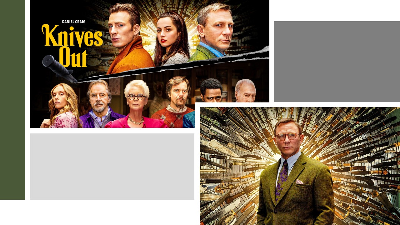 Knives Out là một phim nổi bật của năm 2019 với dàn diễn viên quy tụ các ngôi sao từ nhiều thế hệ: Daniel Craig, Jamie Lee Curtis, Chris Evan, Christopher Plummer, Ana de Armas... Bộ phim xoay quanh quá trình phá án của thám tử Benoit Blanc (do Daniel Craig thủ vai), người được gọi đến bởi gia đình ông cụ tỉ phú Harlan Thrombey sau cái chết bất ngờ của ông. Cho dù các dấu vết cho thấy đây phần nhiều là một vụ tự tử, con cháu trong nhà vẫn hoài nghi và mời Blanc về nhằm tranh giành quyền thừa kế khối tài sản kết xù.